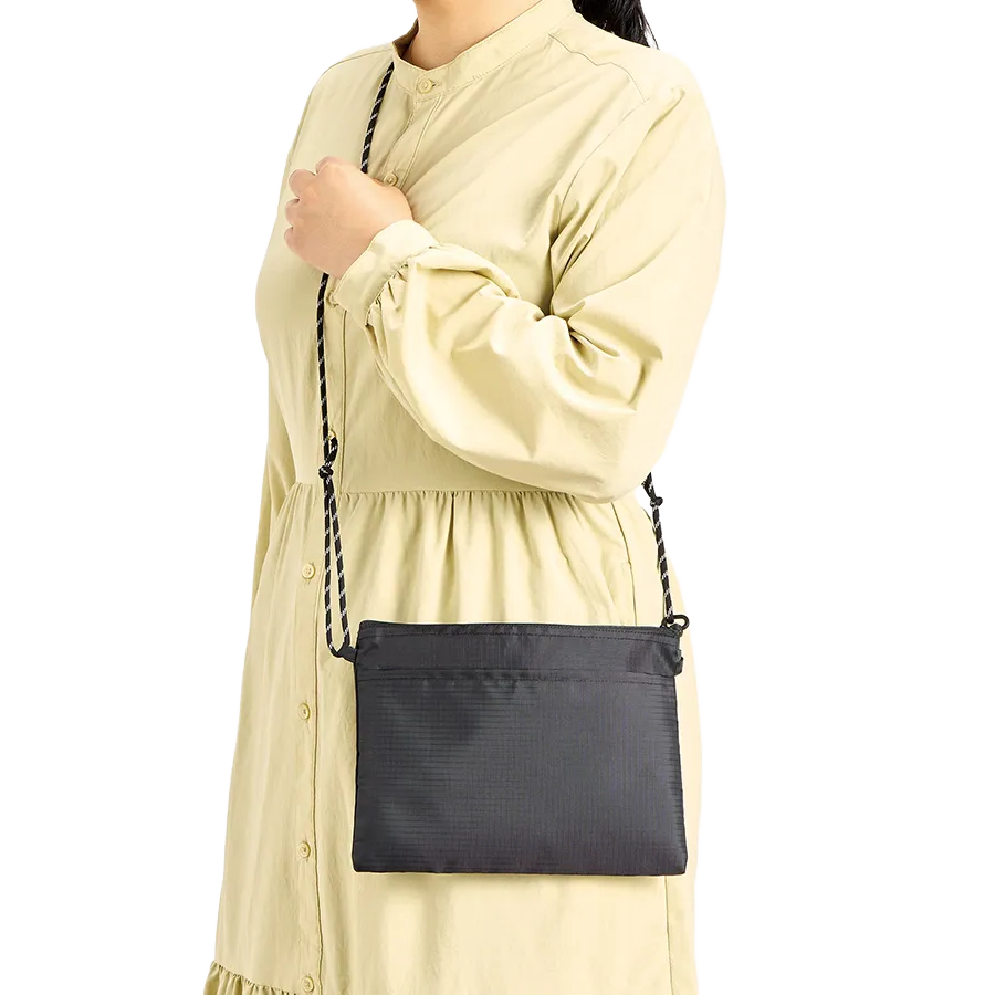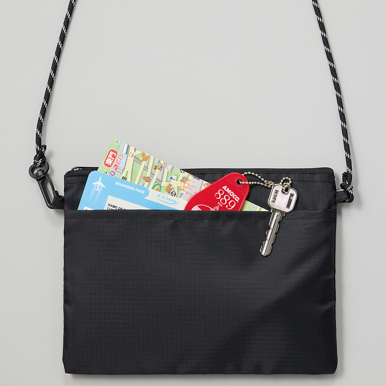 商品概要「リップストップポケットサコッシュ」は、軽量かつ丈夫なリップストップ生地を採用した小型ショルダーバッグです。本体サイズは約W240×H170(mm)、ショルダー部分は約W5×H1250(mm)とコンパクトながら、必要な小物がしっかり収納できるバランスの良いサイズ感です。フロントにはオープンポケットを備え、スマートフォンや交通系ICカードなどの出し入れがスムーズ。さらに、口元は安心のファスナー仕様となっており、財布や貴重品を安全に持ち歩くことができます。ショルダーは結び目部分で長さ調節が可能で、男女問わずお使いいただける汎用性の高さも魅力です。