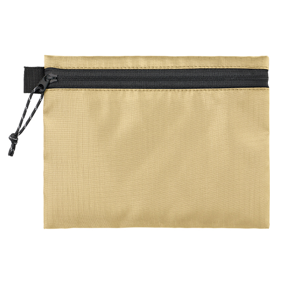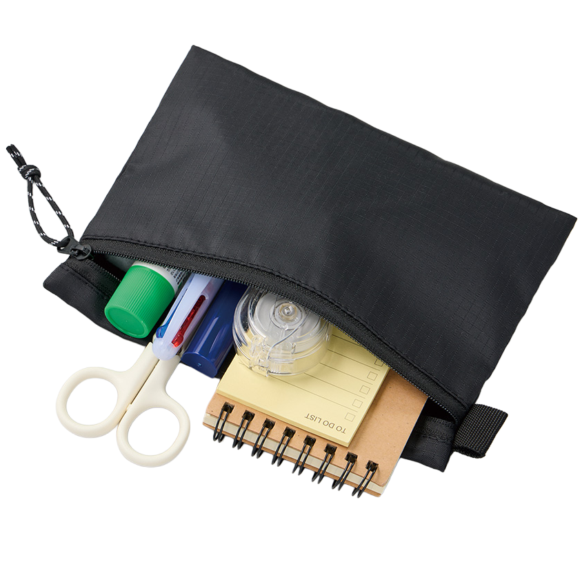 また、このポーチは「Sサイズだからこそ便利」という点も見逃せません。大きなバッグの中で埋もれがちな小物を整理しやすく、デスクワークでも外出先でもスムーズに取り出せるので、時間の無駄やストレスを軽減します。たとえば、「カバンの中がいつもごちゃごちゃ」「筆記用具が見つからない」といった日常の“ちょっとした困りごと”を、この小さなポーチが見事に解決します。さらにリップストップ生地は軽量かつ丈夫なため、繰り返し使用しても型崩れや摩耗が少なく、長期的な利用にも向いています。安価でありながら“安っぽく見えない”点も、ビジネス向けノベルティとして高く評価されています。 カラー展開はネイビー・ブラック・カーキ・ベージュ・ホワイトの5色。性別やシーンを問わず選びやすく、統一感のあるイベント配布やブランドカラー展開にも最適です。たとえば、アウトドア系ブランドならカーキ、コスメブランドならベージュやホワイトといったように、用途やターゲット層に合わせた色展開で効果的なブランディングを行うことができます。