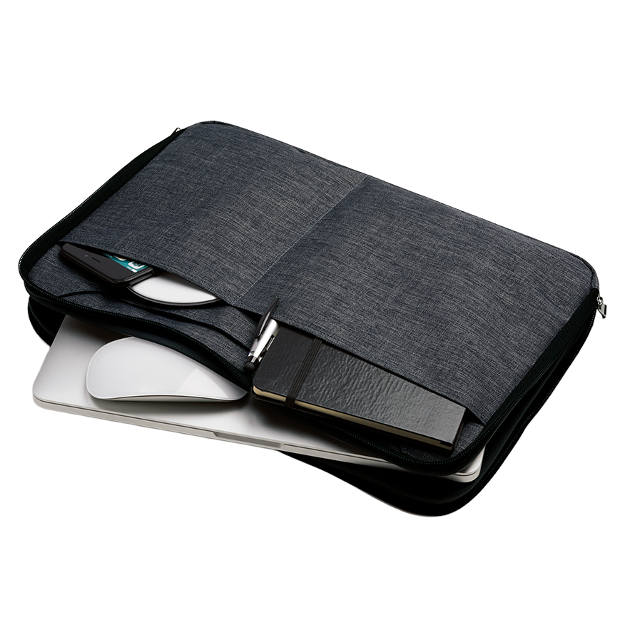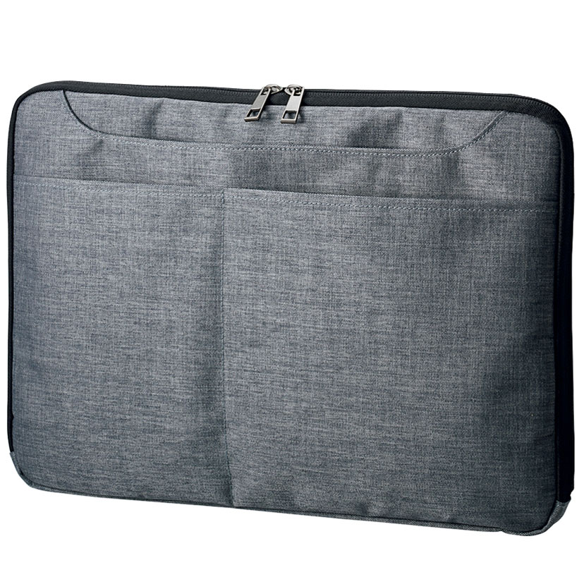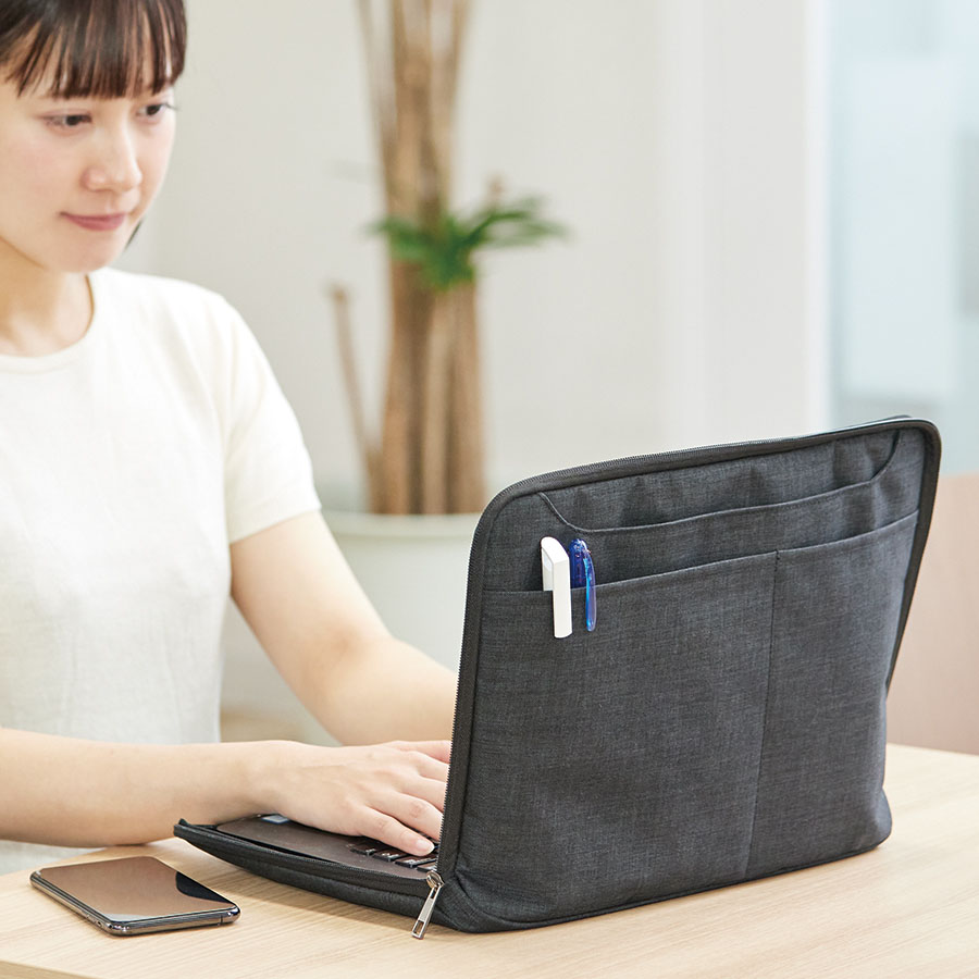 ファスナーを開けばそのままPC操作も可能 外側にはポケットがついており、スマートフォンやノート、ペンなどの収納も可能