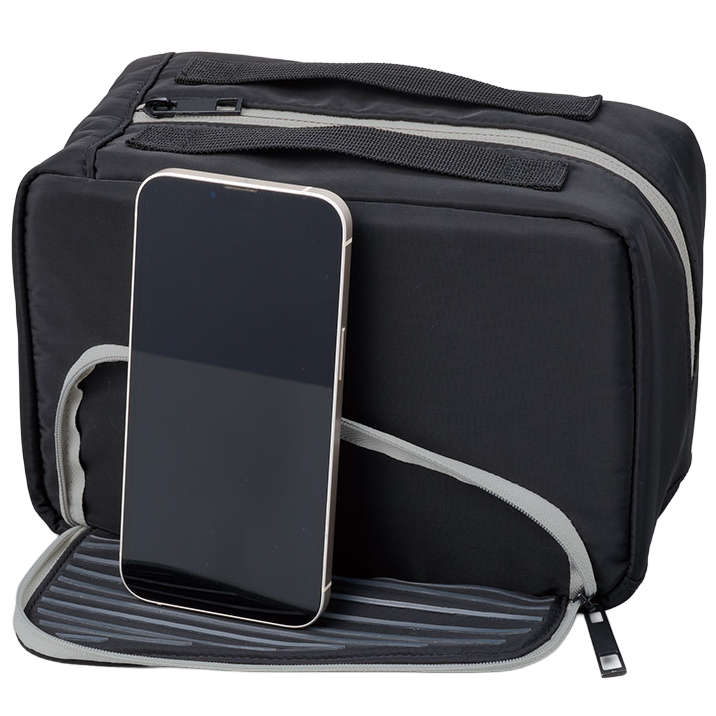 お昼休み、一人でお弁当を食べながら動画を見たりSNSをチェックしたりする時間って、実は一番のリラックスタイムだったりしませんか?でも、ペットボトルにスマホを立てかけては滑って倒れ、ティッシュの箱じゃ角度が合わない。そんな地味なストレスを、この「スマホが立てられるクーラーランチポーチ」は物理的に、そしてスマートに解決してくれます。前面のファスナーをスッと開けて、シリコン加工された部分にスマホを置くだけ。中にしっかりとした板材が仕込まれているから、不安定な公園のベンチや芝生の上でも、まるでそこがデスクであるかのようにスマホが自立するんです。この「どこでもシアター化」する機能、一度味わうともう戻れません。