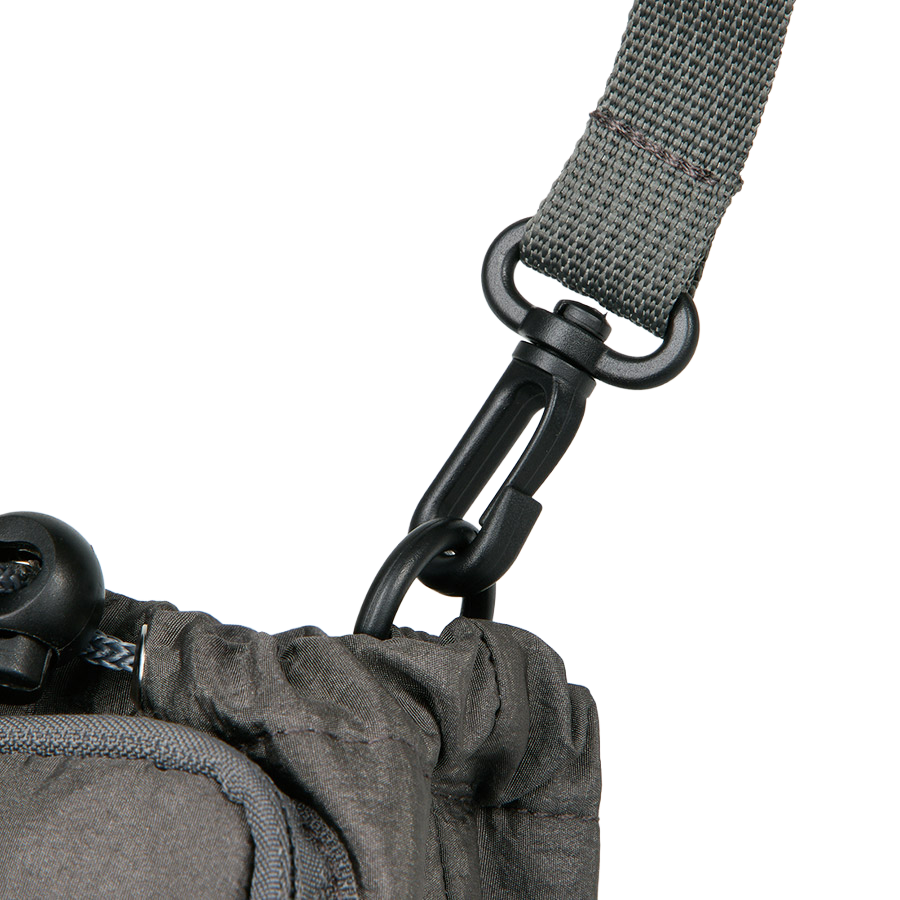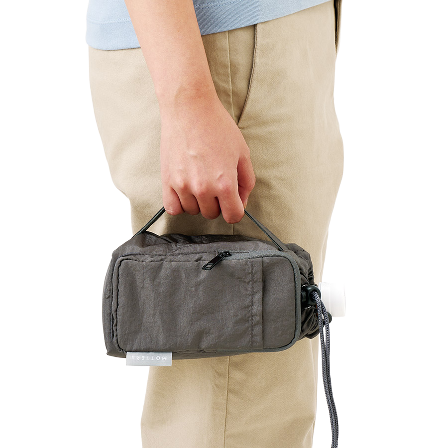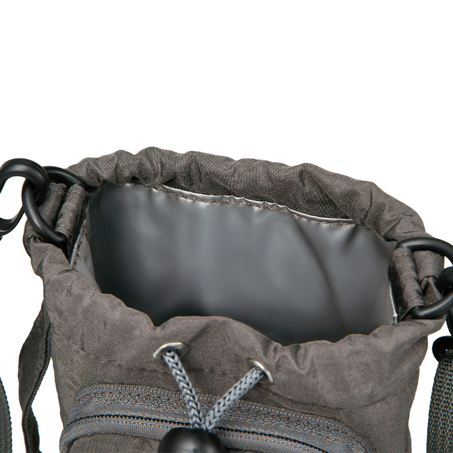これ、ただのボトルホルダーじゃないんです。今のトレンドをぎゅっと詰め込んだ「身につけるギア」なんです。 まず、特筆すべきはこの素材感。「ワッシャー加工」と呼ばれるシワ感のあるナイロン生地を使っていて、これがすごくお洒落。いい意味でノベルティっぽさがなく、セレクトショップに並んでいても違和感のない風合いです。カラーは爽やかなライトブルーと、どんな服にも合うチャコールブラックの2色展開。どちらも少しスモーキーな色合いで、大人が持てるデザインに仕上がっています。