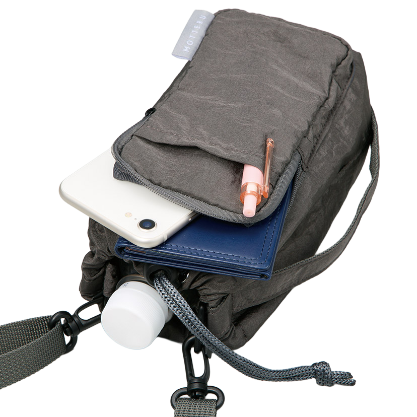 でも、私が一番「わかってるな!」と膝を打ったのは、収納力です。 ボトルを入れるメインスペースの手前に、ファスナー付きのポケットと、オープンポケットが付いています。ここに何が入るかというと、スマホや鍵、ICカード、小銭入れなど、外出に必要な「三種の神器」が全部収まるんです。 つまり、これ一つ肩にかければ、もう他のバッグを持つ必要はありません。両手が完全にフリーになる。フェスで踊る時も、愛犬と走る時も、旅行先で食べ歩きをする時も、この身軽さが最強の武器になります。