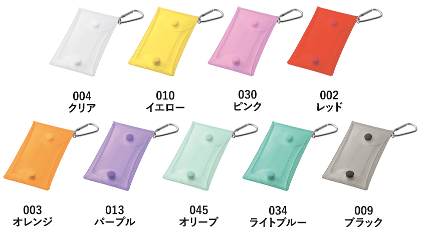 カラーバリエーションは全9色。クリア、イエロー、ピンク、レッド、オレンジ、パープル、オリーブ、ライトブルー、ブラックと、どんなブランドイメージやキャラクターカラーにも対応できる豊富な展開です。アソート提案も可能なので、複数メンバーのいるアイドルグループやキャラクター展開にも柔軟に対応できます。 ボタンは本体カラーに統一され、カラビナはシルバーで統一感のある仕上がりになっています。