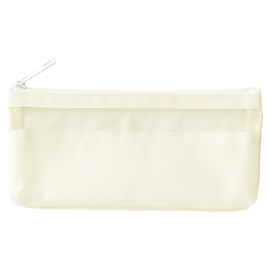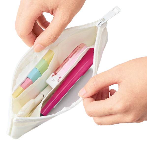 最大の特徴は、内部の3つの仕分けポケット。ペンケースというと一つの袋にすべてを放り込むタイプが多いなか、このポーチはポケットで区切ることで中身が混ざらない設計になっています。たとえばメインスペースにペン類、手前のポケットにクリップや付箋、もう一つのポケットにUSBメモリや消しゴム——という具合に、自分なりのルールで整理できる。ポケット部分にはメッシュ素材が使われているから、閉じたままでも中身が透けて見える。「定規どこだっけ」と探す時間が、ほんの少しだけど確実に減ります。
