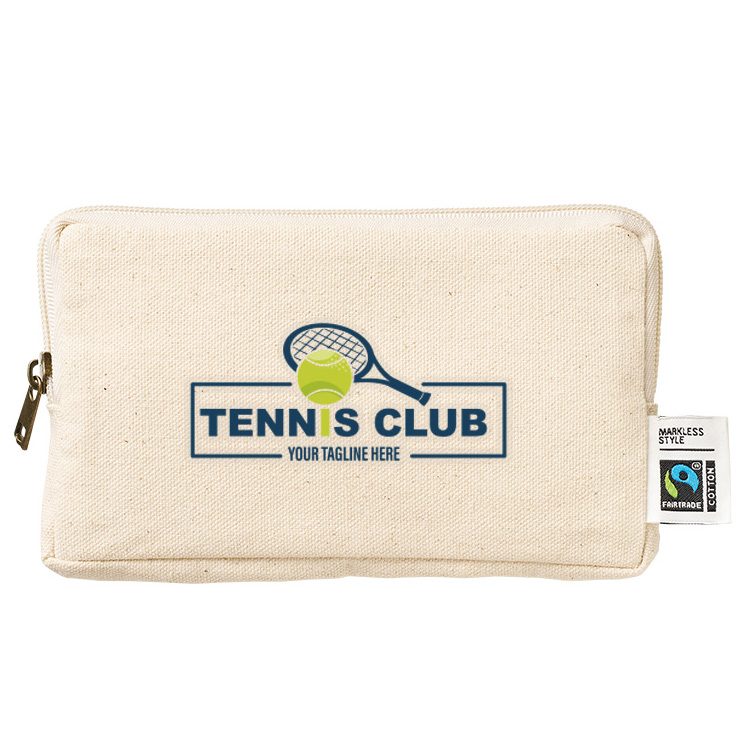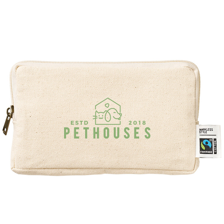 困りごとを解決する、という視点でも触れさせてください。「ノベルティにお金をかけすぎたくない、でも安っぽく見えるのは嫌」——この相談、本当に多いです。このポーチは無地のナチュラルカラーにフェアトレードラベルという組み合わせで、すでに雑貨店に並んでいるような佇まいがあります。そこに名入れを加えると、量産品なのに一点ものっぽい空気をまとう。コストは抑えたい、でも渡したときに「お、いいじゃん」と思ってほしい。そのちょうど真ん中を狙える一品です。