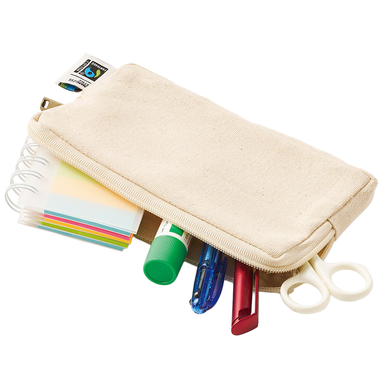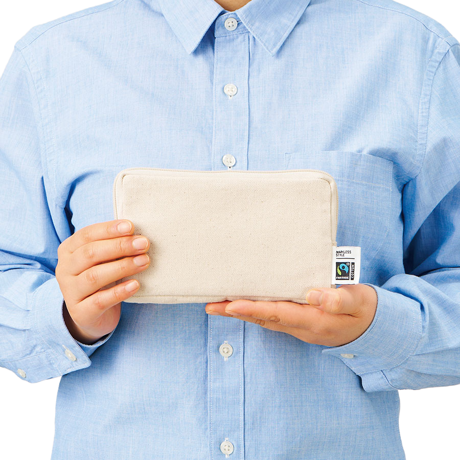 環境にも使う人にもやさしい、フェアトレード認証オーガニックコットンを贅沢に使用したナチュラルポーチが登場しました。絶妙なマチ幅設計により、文房具や小物をしっかりと収納できる十分な容量を確保しながら、小ぶりなバッグにもすっきり収まるスリムでミニマムなデザインに仕上げました。最大の特長は、コの字型に大きく走るファスナー。口が大きくガバッと開くため、中身を一目で見渡せて、奥に入れた小物もサッと取り出せる優れた機能性を実現しています。素材には、厳選したフェアトレード認証コットンとオーガニックコットンを採用。フェアトレードとは、発展途上国の原料や製品を適正な価格で継続的に購入することで、生産者の生活改善や経済的自立を支援する国際的な取り組みです。本製品に使用されているコットンも、フェアトレード認証生産者から国際基準に従って丁寧に調達された認証コットンのみを使用しており、商品の外側にはその証であるフェアトレード認証ラベルが誇らしげに付けられています。さらに、有機農法で大切に育てられたオーガニックコットンは、化学合成された肥料や農薬を3年以上使用していない農地で栽培された、環境に配慮した地球にやさしい天然素材。土に還る自然の恵みをそのまま活かしたコットンならではの、素朴であたたかみのある風合いと、使い込むほどに手に馴染む優しい肌触りをお楽しみいただけます。ペンケースや化粧ポーチ、トラベルポーチ、ガジェットケースとしてはもちろん、サステナブルなライフスタイルを大切にされる方への贈り物としても最適な一品です。エシカル消費やSDGs、サステナブルファッションに関心のある方、ナチュラル志向の方、オフィスや学校で差がつくおしゃれな小物をお探しの方に、自信を持っておすすめできるエコフレンドリーなアイテムです。