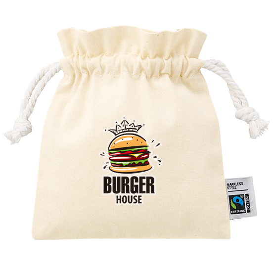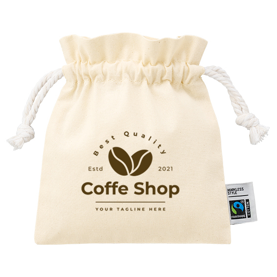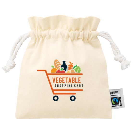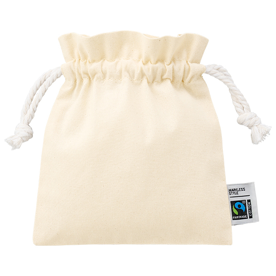 ここで少し、お客様の困りごとに触れておきます。「ノベルティに予算をかけすぎたくない、でも紙袋ひとつで済ませるのはちょっと寂しい」。そういう声を、何度も聞いてきました。この巾着は、その真ん中をうまく埋めてくれる存在です。単価を抑えながらも、フェアトレード認証ラベルがついているだけで、受け取った側の印象がまるで違う。安っぽい、という感覚にはならない。ちゃんと選ばれた物だな、という空気をまとってくれます。