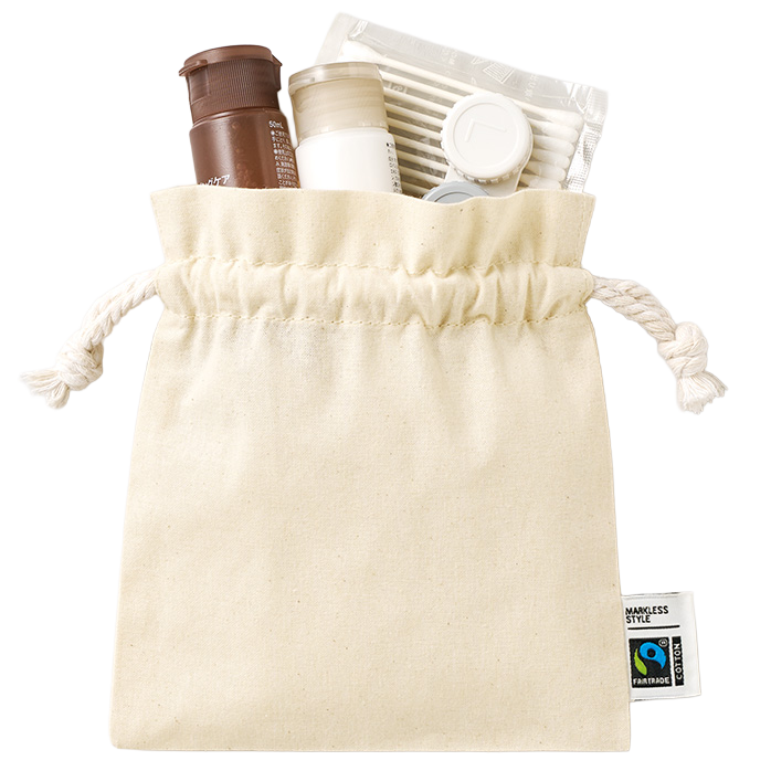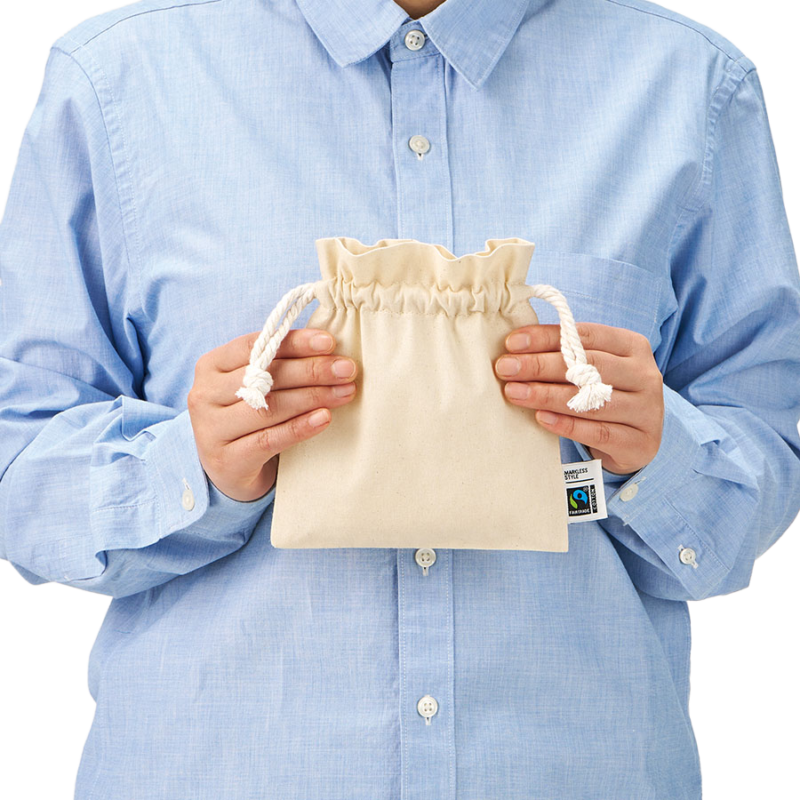 口元にやさしく立ち上がるフリルが華やかな印象を添える、こだわりの巾着袋です。正方形に近いバランスの良いフォルムが洗練されたデザイン性を演出し、小物入れやコスメポーチ、ギフトラッピングとしても幅広くご活用いただけます。引き紐には風合い豊かなロープタイプのフェアトレードコットン紐を採用し、ナチュラルで温かみのある表情に仕上げました。 本製品はフェアトレード認証コットンを使用したエシカルなアイテムで、外側にはフェアトレード認証ラベルをしっかりと縫い付けています。フェアトレードとは、発展途上国で生産された原料や製品を適正な価格で継続的に購入することにより、現地の生産者の生活向上と経済的自立を支援する取り組みのこと。本商品に使用しているコットンも、フェアトレード認証を受けた生産者から厳しい基準に基づいて調達された安心の認証コットンです。 さらに注目したいのが、環境に配慮したオーガニックコットンの魅力。オーガニックコットンとは有機農法によって育てられた綿花のことで、化学合成された肥料や農薬を3年以上使用していない農地で丁寧に栽培されています。肌にも地球にもやさしいサステナブル素材として、SDGsやエコ活動に関心の高い方、環境意識の高い企業様のノベルティや販促ギフトにも最適です。 ナチュラルな風合いと上質な素材感、そして社会貢献というストーリーを兼ね備えた、選ばれる理由のある巾着ポーチ。日常使いから贈り物まで、さりげなくエシカルなライフスタイルを彩る一品としておすすめです。