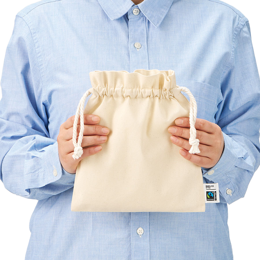 口元にふんわりと立ち上がるフリルが上品で華やかな印象を演出する、MARKLESS STYLEのフェアトレードコットン巾着ポーチです。正方形に近い整ったフォルムと、しっかりと編み込まれたロープタイプのフェアトレードコットン紐が、シンプルながらも確かなデザイン性を感じさせる仕上がり。ナチュラルな風合いの生成り生地は、コスメポーチやペンケース、小物入れ、旅行用のトラベルポーチとして幅広くお使いいただけるほか、ギフトラッピングの代わりとしてもおすすめで、贈り物に優しい温かみを添えてくれます。 素材には、フェアトレード認証を受けた生産者から基準に従って調達された認証コットンを使用。フェアトレードとは、発展途上国の原料や製品を適正な価格で取引することで、現地の人々の生活改善や自立を支援する国際的な取り組みであり、商品の外側にはその証としてフェアトレード認証ラベルが縫い付けられています。さらに、使用されているコットンは化学合成された肥料や農薬を3年以上使用していない農地で栽培されたオーガニックコットン。有機農法によって丁寧に育まれた素材は、肌にも地球にもやさしく、サステナブルな暮らしやエシカル消費、SDGsへの取り組みを意識する方にふさわしい一品。 日々のちょっとした持ち運びから、企業のノベルティ、販促品、エコギフト、結婚式のプチギフトまで、幅広いシーンで活躍するこの巾着ポーチは、ものを大切にする気持ちと、世界とつながる優しさを同時に届けてくれる、心地よい一枚です。